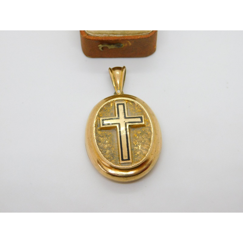 Details: A fantastic and wonderfully designed antique Victorian pinchbeck mourning locket pendant adorned with a black enamel cross to the front and original glass fittings c1860. This is a wonderful item that would make a perfect gift or addition to any c