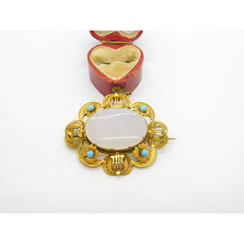 Details: A fantastic and wonderfully designed antique Victorian pinchbeck gold, turquoise and chalcedony floral brooch with lovely detailing c1860. This is a wonderful item that would make a perfect gift or addition to any collection. The BOX pictured is f