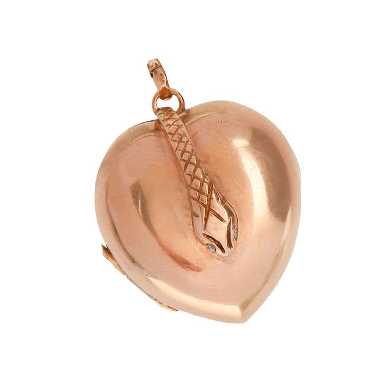 On the front, a snake slithers down about halfway. Two teeny rose cut diamond eyes gaze downward. The snake has an incised snakeskin pattern to its body and the meaning is one of eternity and love.