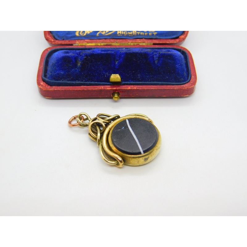 Details: A fantastic and wonderfully designed Victorian rolled gold spinning fob pendant set with banded agate and sardonyx c1850. This is a wonderful item that would make a perfect gift or addition to any collection. The BOX pictured is for PRESENTATION O