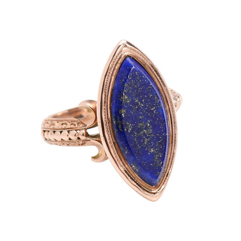 Like looking up at the Milky Way, flecks of golden "stars" prick the surface of this intense royal blue lapis lazuli gem.Marquise in shape, the midnight bright blue is even in coloration throughout and the swathe of pyrite dapples the surface from top to b