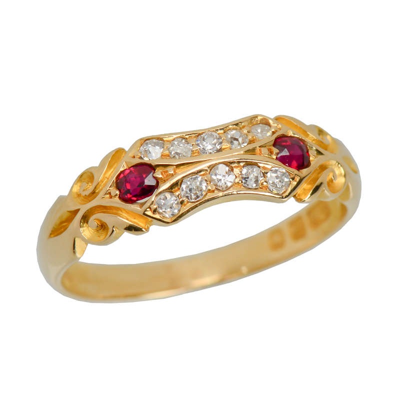 Our minds must stretch all the way back to the year 1886 to reach the time when this ring was created.Of 18k yellow gold, rubies, and diamonds, it looks as if it was almost never worn. Resting very low on the finger, it is effortless to wear, yet has a ple
