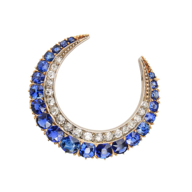 Fine sapphires stand out from afar. Clear, mesmerizing and suffused with animated color, they are unmistakable.A crescent moon takes us to the celestial abode with a classic Victorian 1880s motif. Twenty one oval and mixed cut natural blue sapphires will t