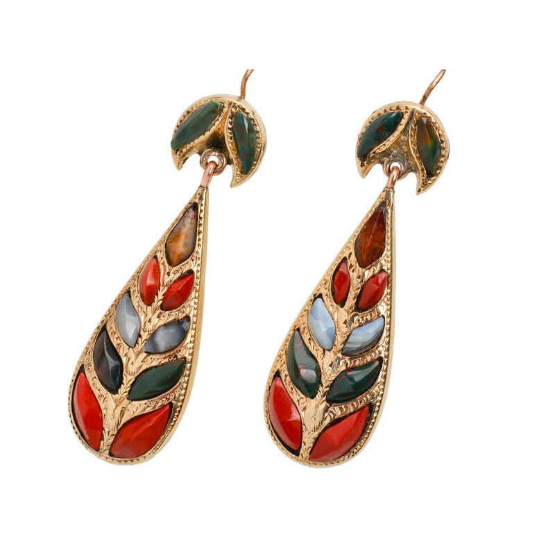 Most of the agate jewelry was created in silver. But a few pieces were constructed in gold as in these 9k earrings.