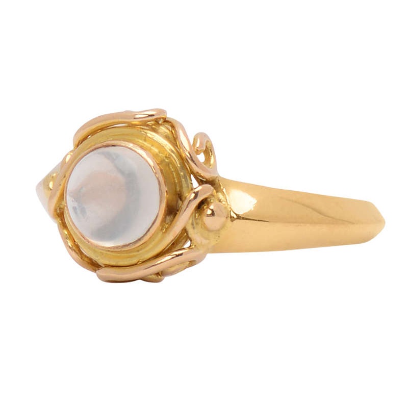 It is bezel set in 15k yellow gold with an unusual curvilinear gold to the gallery.