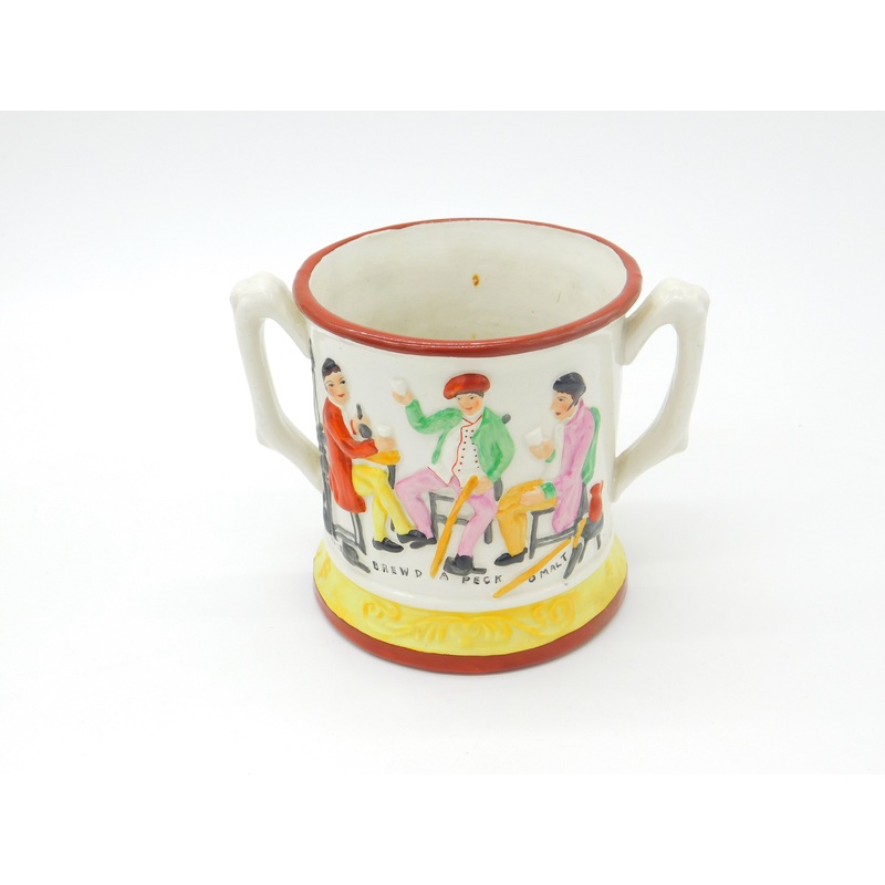 Details: A fantastic and wonderfully designed antique early Victorian staffordshire ceramic loving cup frog mug depicting men drinking in the pub with Robbie Burns verse 'Willie Brewd a Peck O'maut' c1850. This is a wonderful item that would make a perfect