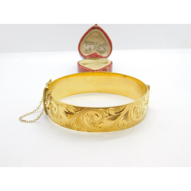 Details: A fantastic and wonderfully designed antique art deco 9ct yellow gold on metal core Victorian revival bangle bracelet hallmarked to the interior c1940. This is a wonderful item that would make a perfect gift or addition to any collection. The BOX pictured is for PRESENTATION ONLY and is NOT included in the listings but used to frame the pictures unless specifically stated otherwise.