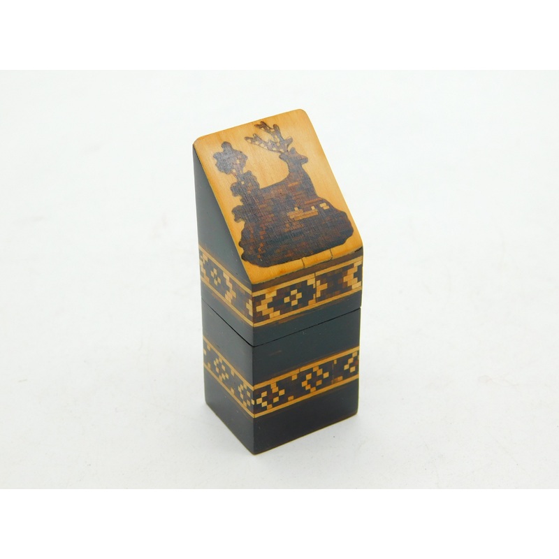 Details: A fantastic and wonderfully designed antique Victorian tunbridge ware treen needle case with charming stag deer pattern to the top c1860. This is a wonderful item that would make a perfect gift or addition to any collection. The BOX pictured is fo