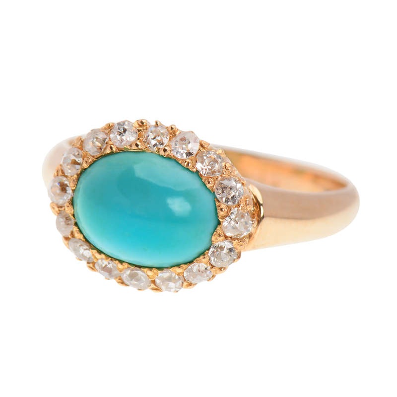 Gloriously hued, a 2 carat turquoise oval cabochon rests nestled among an 18k rose gold setting.A splash of old European cuts with old single cuts, 16 in total, weigh in at of .48 carats. White to the eye at H-I color and SI1-3 for clear inclusions, they f