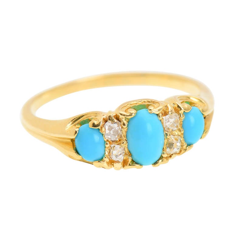 Three robin’s egg blue natural turquoise pair up with chunky old cushion cut diamonds for an 15k gold ring you will cherish for years.