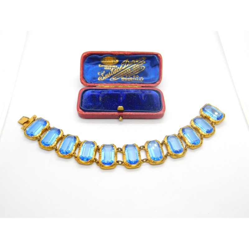 Details: A fantastic and wonderfully designed antique Victorian yellow metal panel bracelet set with emerald cut blue paste stones possibly Czech c1900. This is a wonderful item that would make a perfect gift or addition to any collection. The BOX pictured