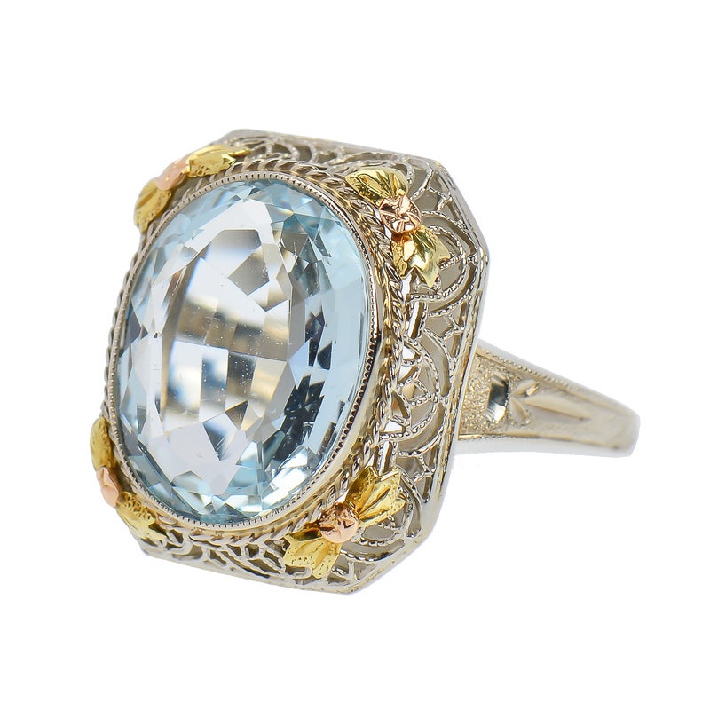 Bow appliques of rose and yellow gold mark the corners of an eight-sided matrix. Complementing the setting is a breathtaking oval faceted aquamarine of 4.8 carats bounded with a white gold bezel decorated with a saw-tooth perimeter and twisted yellow gold wire work.