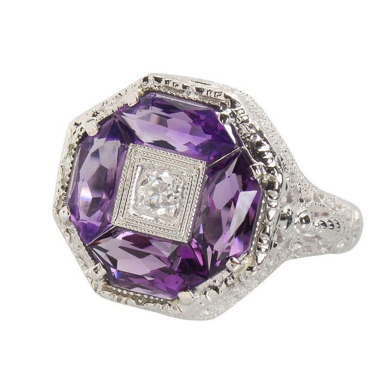 A medley of fancy cut amethysts, lacy filigree with dragonfly motifs, a diamond, and an utterly enchanting design far surpass the usual.Four vivid amethysts total 2.25 carats of sheer, colorful vibrancy. At the center of these is placed an old European cut