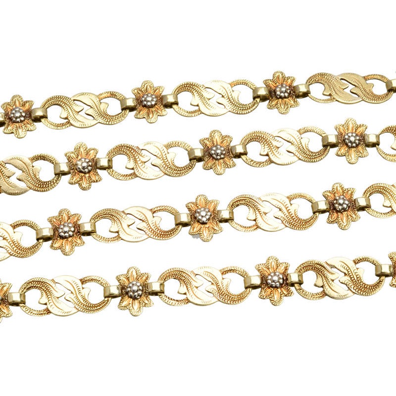 From Vienna around the year 1940 hails this irresistible necklace.In 14k yellow gold, there are touches of white gold on the flower centers. The chain is entirely handmade and engraved. Two types of links join forces for a "wear it everyday" chain that has