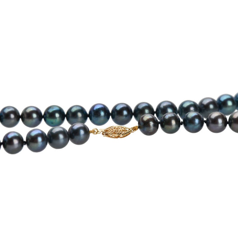 Black pearls are in fact anything but black. This chic single strand necklace is imbued with colors that range from iridescent hues of forest green, smoky mauve, deep ocean blue to mink browns.