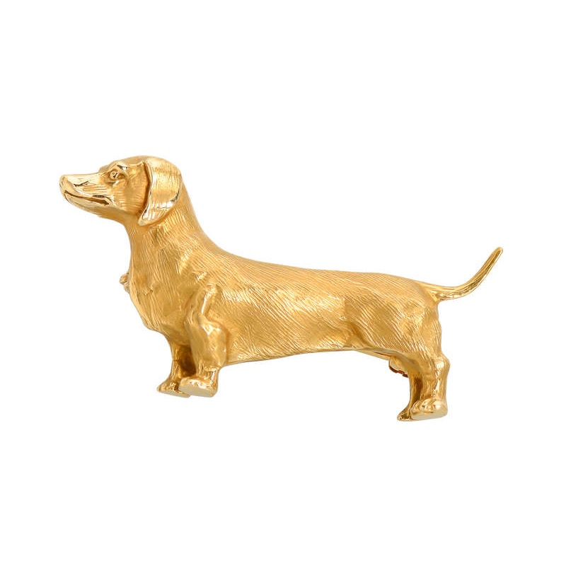 Ready for adoption….this loveable 14k gold dachshund vintage brooch goes where you do with her characteristic pert and larger-than-life feisty attitude.