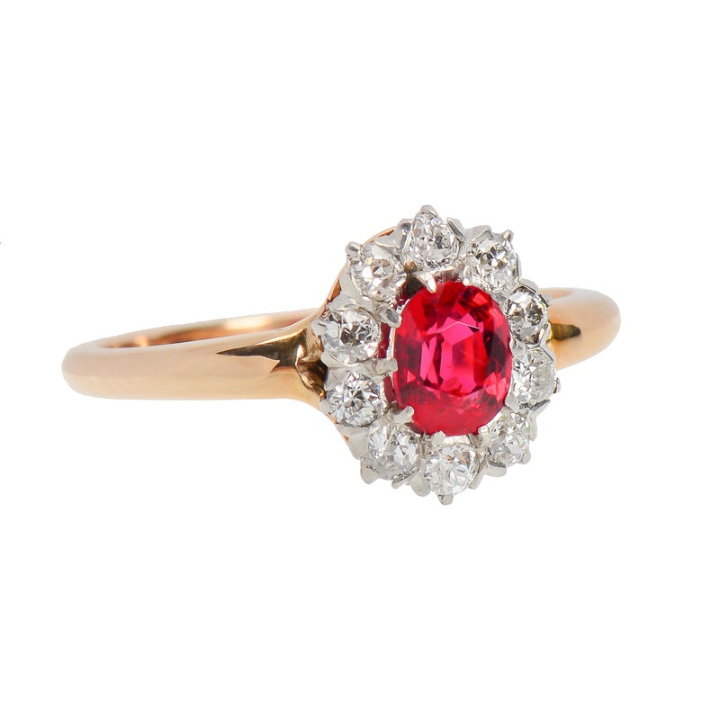 Beautiful enough by themselves, this oval faceted spinel of .55 carats is enhanced by being surrounded with a halo of ten old European cut diamonds, total weight of .50 carats (I-J color; SI1-3 clarity).