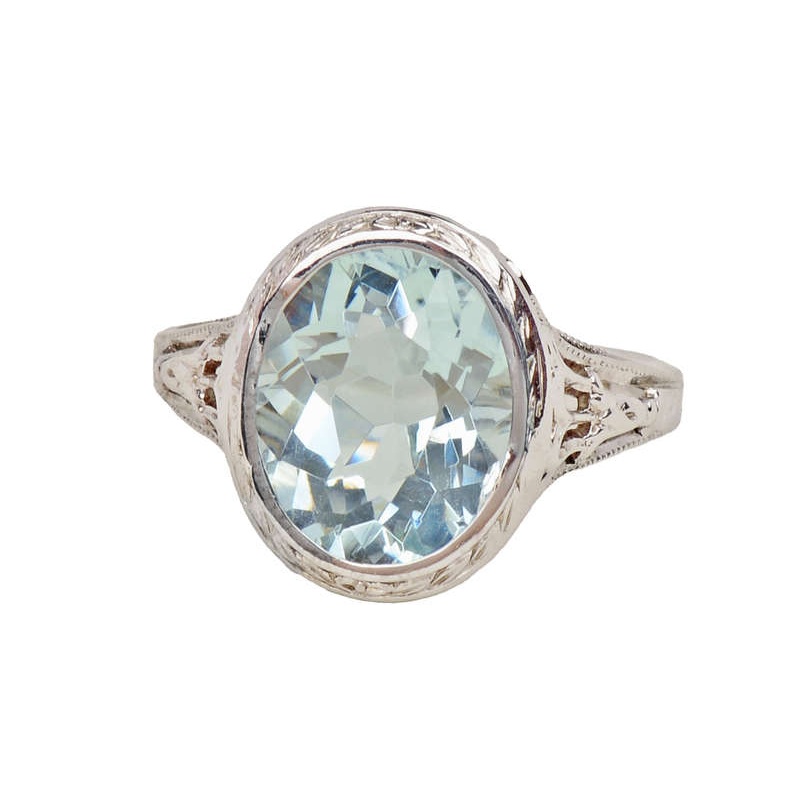 Can a vintage ring be more heavenly? An ethereal, natural, pale blue aquamarine of 3.10 carats sets the tone for this ultimately wearable ring.The gemstone has been shaped in an oval, faceted to perfection, and placed within the boundaries of a 14k white g