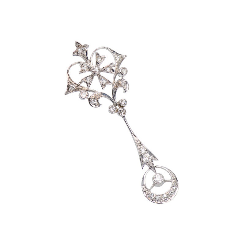 The foliate stem terminates with a modified arrow shape and suspends a diamond encrusted crescent moon.
