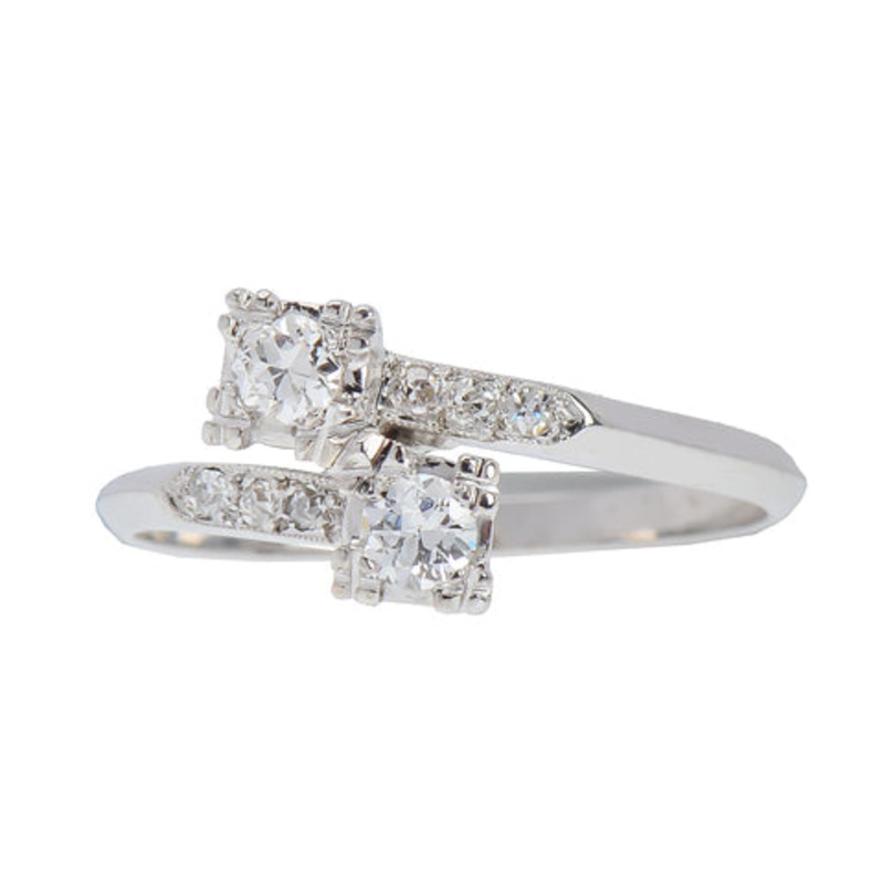 This 14k white gold crossover or bypass ring features two old European cut diamonds, of .30 carats each. Also six .02 carat single cut diamonds with a total of .42 carats (H-I color; VS2-SI1 clarity).