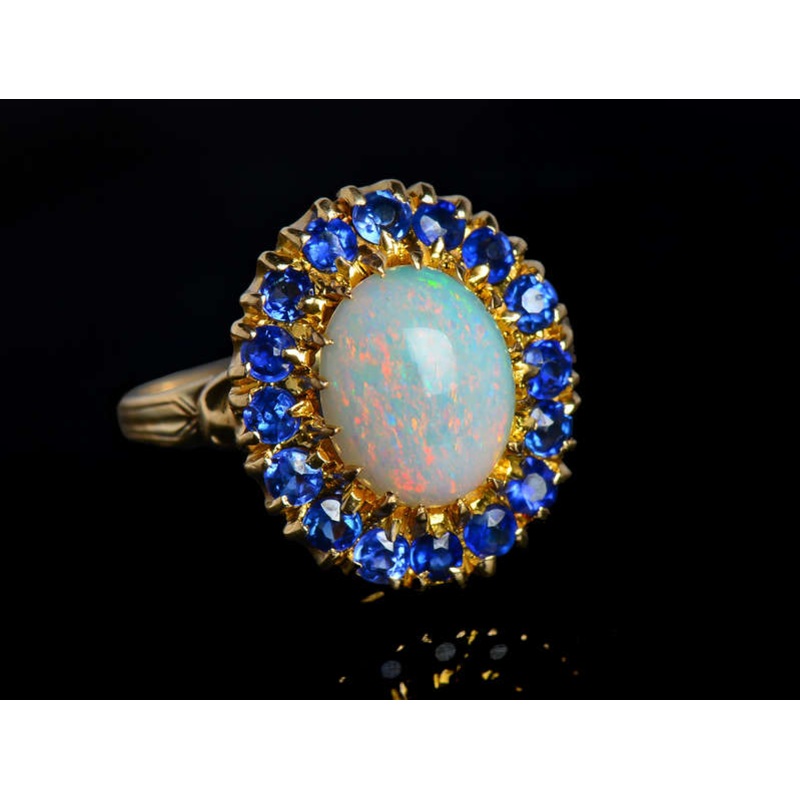 Some of the more beloved vintage jewelry comes with a story and a hint of its long history. Engraved and dated to the interior, this ring of 1940 contains both blow-out blue sapphires and a radiant Australian opal.