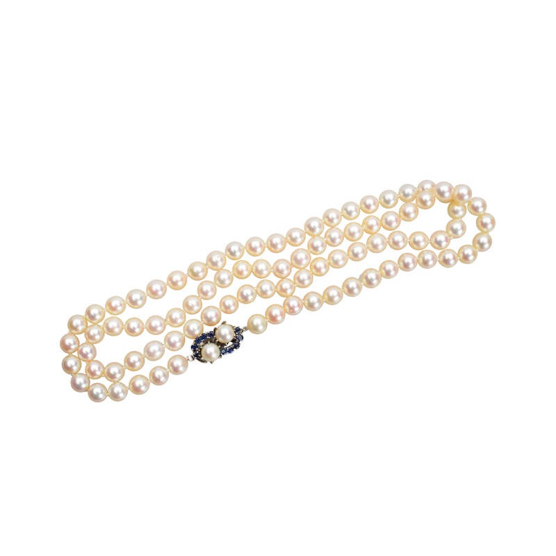 A double pearl clasp sets up visual contrast by opposing two luminous pearls with 10 natural blue sapphires. Their total weight is .90 carats; their deep azure blue hues are perfectly suited to their 14k white gold setting.