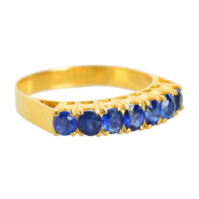 Rich, deep blue sapphires rest amidst 18k yellow gold for a wedding band, ring guard or one that you may even stack with others for a classic and striking color packed style.