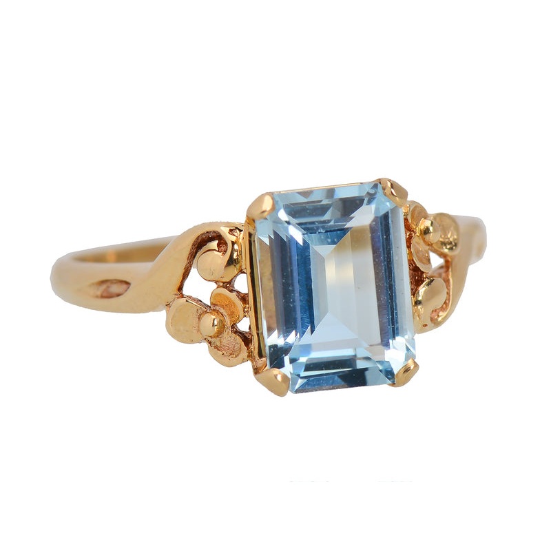 Corner prong set, the aquamarine’s complimentary gold color mounting is graced with two flowers set opposite on each side.