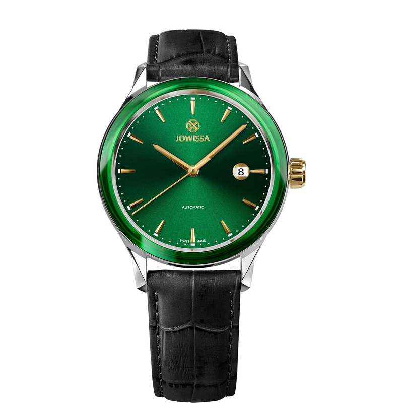 This automatic mens watch is a handsome timepiece that attracts positive attention thanks to a bright green dial and black leather leather strap. Gold-tone details on the dial and facets on the crown stand out. You can also see the movement and intricacies of the components in action. Swiss Made and hand-assembled.