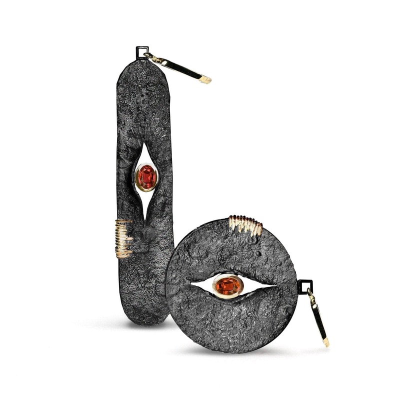 Echoes of ancient Egyptian gods are present in these quirky earrings. Textured raw panels of precious metal are encrusted with sinuous gold shapes. Beautiful shining garnets sit on each earring adding glimmering beauty. Gold detailing completes the design.