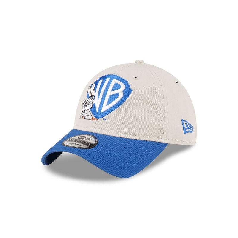 The Warner Brothers Shield Pack 9TWENTY Adjustable Cap features an embroidered Warner Brothers logo and Bugs Bunny at the front panels with a blue visor, a blue undervisor, and an adjustable D-Ring closure at the rear.