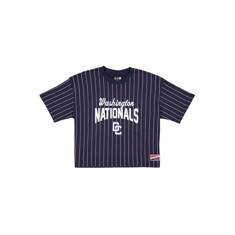 The Washington Nationals City Connect Women's Pinstripe T-Shirt features a screen-printed Nationals wordmark and logo at the front with a New Era jock tag at the left hip. Fabric: 63% Cotton, 37% Polyester