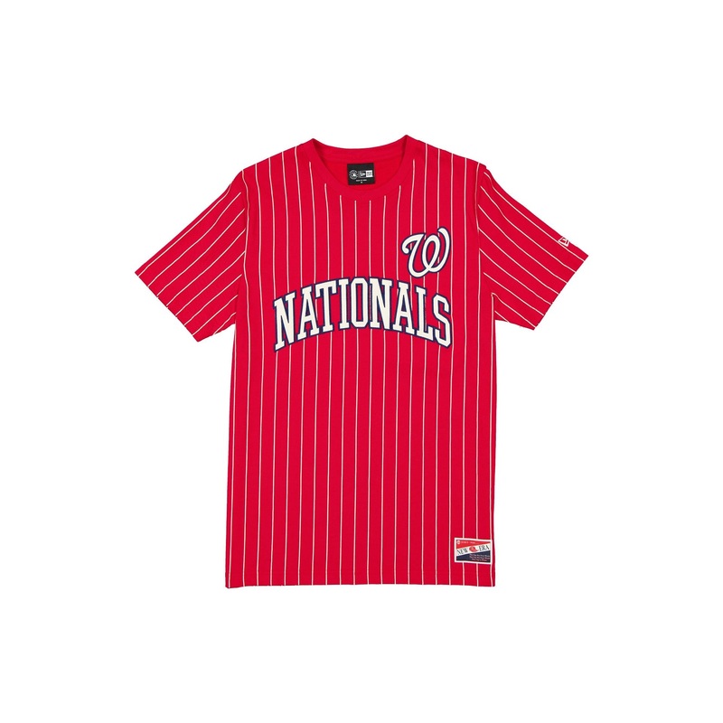 The Washington Nationals Throwback Pinstripe Wordmark T-Shirt features a twill applique Nationals wordmark and logo at the front with a New Era jock tag at the left hip.