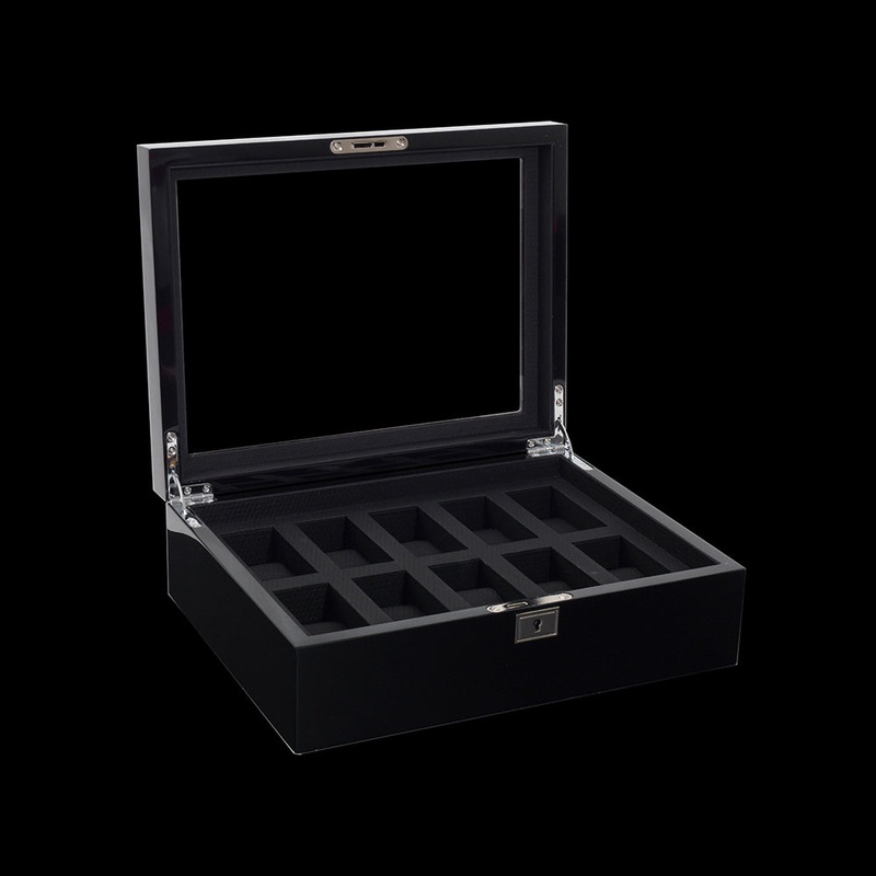 A gentlemans haven and a watches safe harbour. Display and organize your timepieces with class. The Savoy 10-piece watch box features a ten-time hand-polished burlwood exterior, black textured silk lining, locking glass cover, and gold-finished hardware su