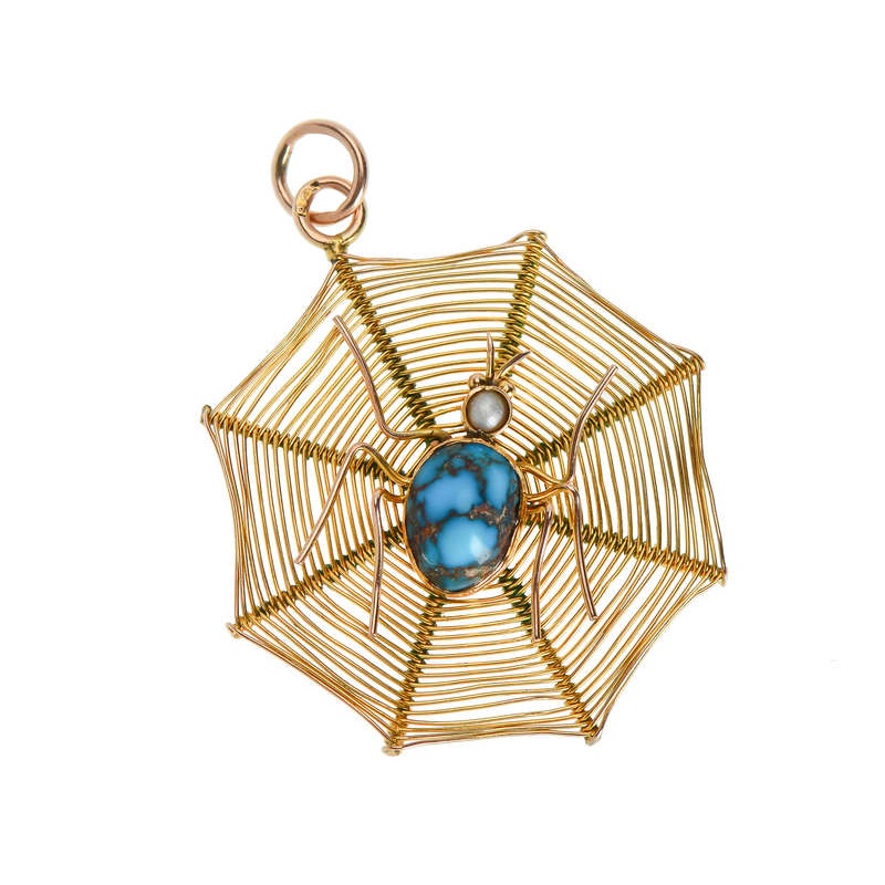An antique Victorian English spider and web pendant present an utterly charming depiction of the natural world. Beautiful woven, 9k yellow gold is wound and wound around eight spokes radiating outward from the center. Vivid turquoise with dark veins and ma