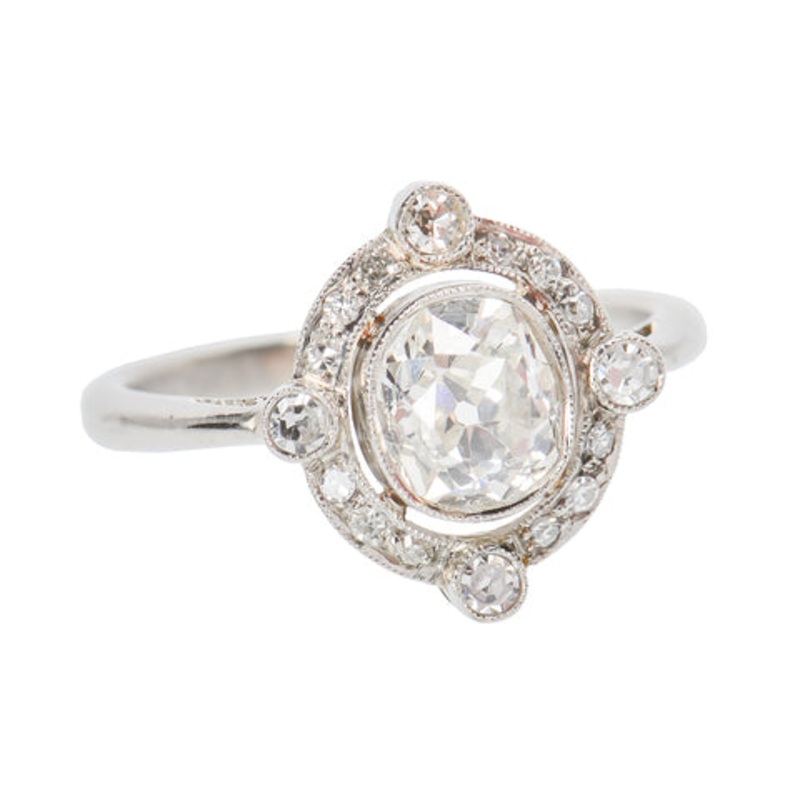 Perhaps a new name, the floating halo ring might do. An antique old mine cut diamond of 1.25 carats (I-J color; SI2 clarity for a clear inclusions off the side) rests nestled within the contours of a platinum bezel accented with mille grain work.