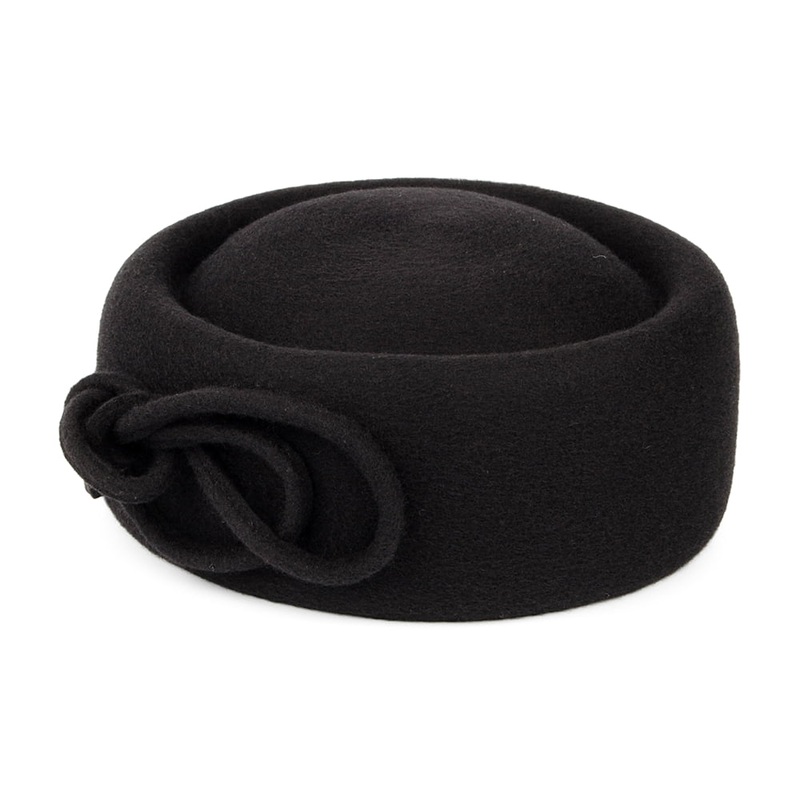 Whiteley Bouvier Pillbox Hat in black. The wool felt pillbox features a lovely decorative bow on the front. There is a grosgrain sweatband on the inside of the hat. An elastic cord secures the pillbox to your head and ensures you look fantastic.Hat Details