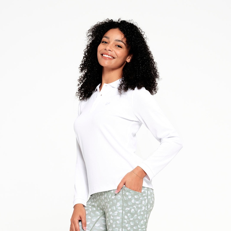 Presenting the Long Sleeve Polo in White for women from Cancer Council. Featuring full-length arms, a neat collar, and buttoned front, this versatile piece is perfect for any task – whether it be work, leisure, walking, or gardening. Complete your look with our Active Leggings.