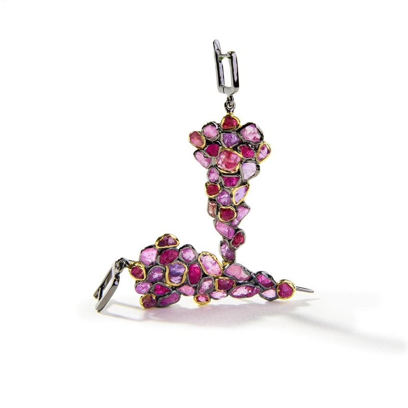 The Wren Rough Pink Sapphire and Ruby Earrings by showcase an innovative setting technique, combining rough pink sapphires and rough rubies in 925 sterling silver. Plated with 18K gold and black rhodium, these earrings highlight the untamed allure of the n