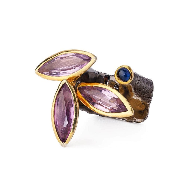 Graceful yet organic and holding within its grasp all the power of nature this ring is an exclusive one-off design. A trio of amethyst gemstones mirror the natural leaf while a single bold blue sapphire offers a spark of sumputous color. Black rhodium crea