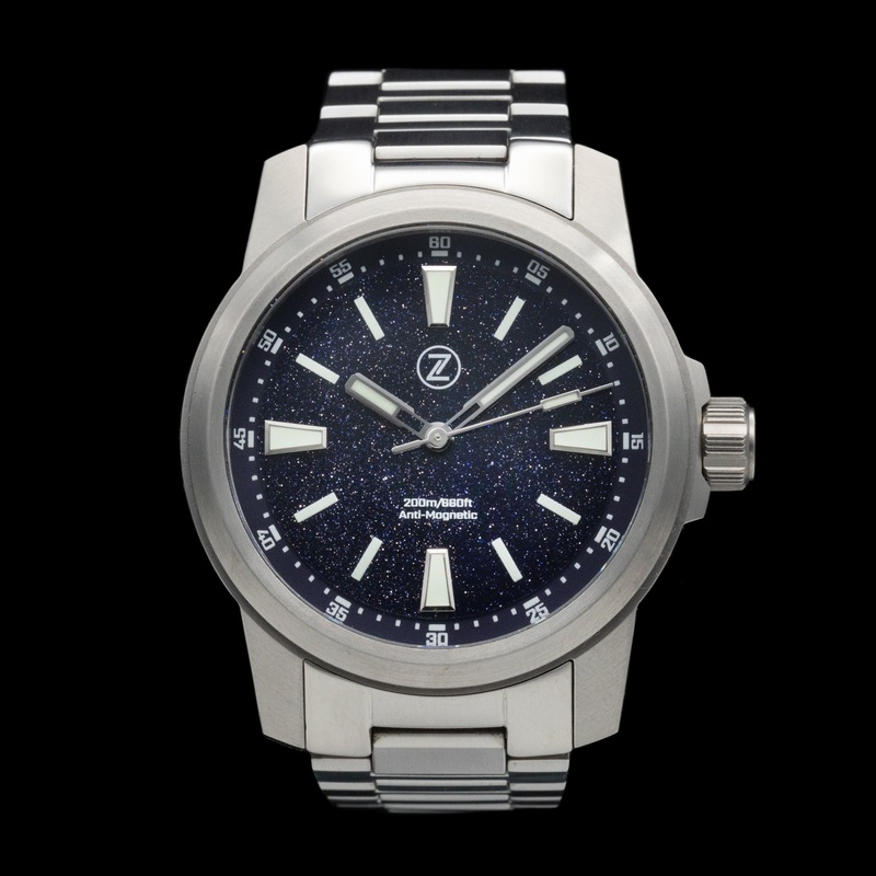 The true highlight of this timepiece is its aventurine dial, a deep blue with sparkling flecks that mimic a starry night sky. Each dial is unique, ensuring no two watches are exactly alike.The sapphire crystal enhances durability, while the screw-down crown and 200-meter water resistance make it a capable tool watch for any terrain.