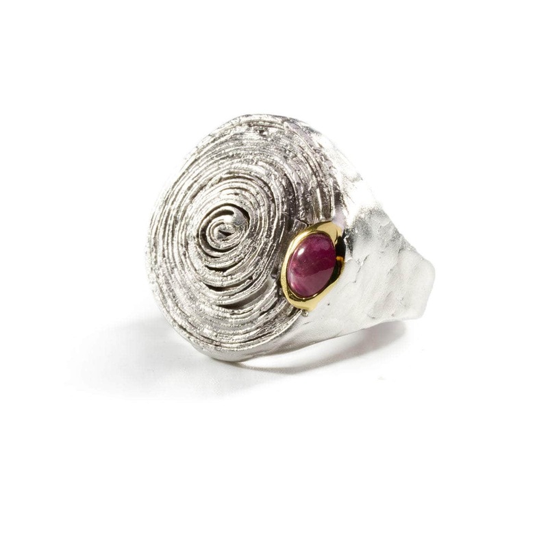 Can you count these concentric circles on a tree stem, the annual rings of your growth? Add a grain of Percephona's garnet to remind you the best about living on Earth. Metal: 925 SilverStones: GarnetPlating: White Rhodium, 18K GoldWidth 22 mmBand wide 4 m
