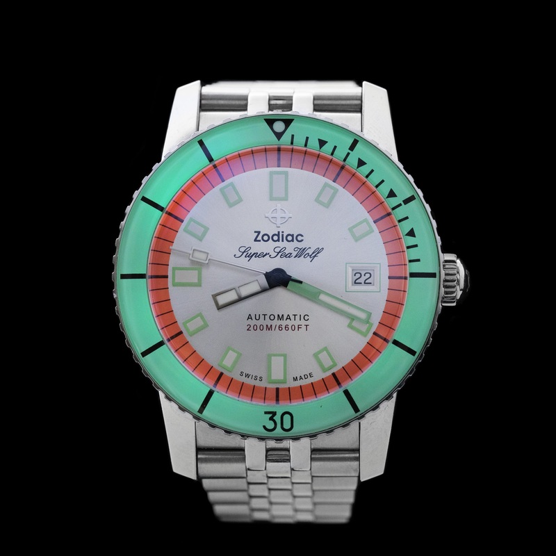 One of the most eye-catching dive watches to grace the seven seas. The bright green bezel complements the coral coloured minute track in a surprisingly effortless manner. This full set is in great condition and could make for a great colourful winter watch.