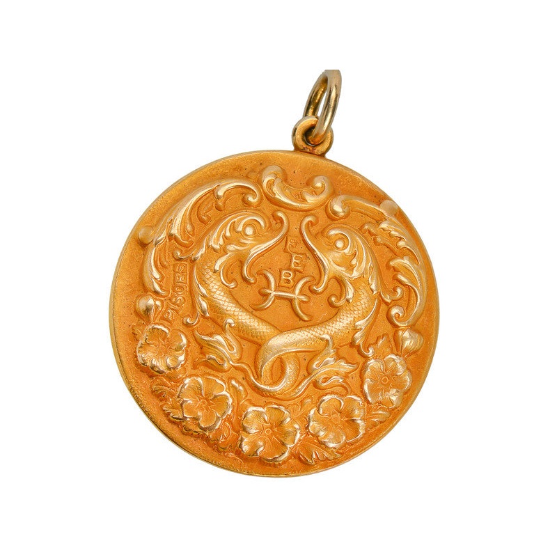 One of their collections focused on a series of astrological or Zodiac signs in locket form or in a pendant. Quite ornate and in the manner of Art Nouveau, this 14k yellow pendant features a high relief design for the sign of Pisces, birth date Zodiac for February 19th through March 20th.